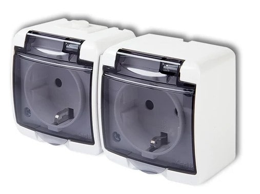 Karlik Junior 2x2P+F falon kívüli vízmentes dupla dugalj átlátszó,IP44,Füst Fedél
